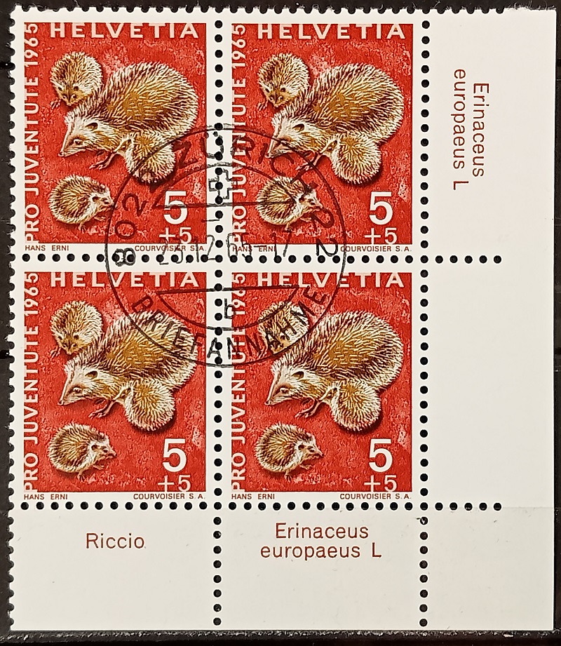Viererbloack 4x5+5 C. Einheimische Wildtiere Igel, Gummierung intakt, schöner Stempel 23.12.65 - Zürich