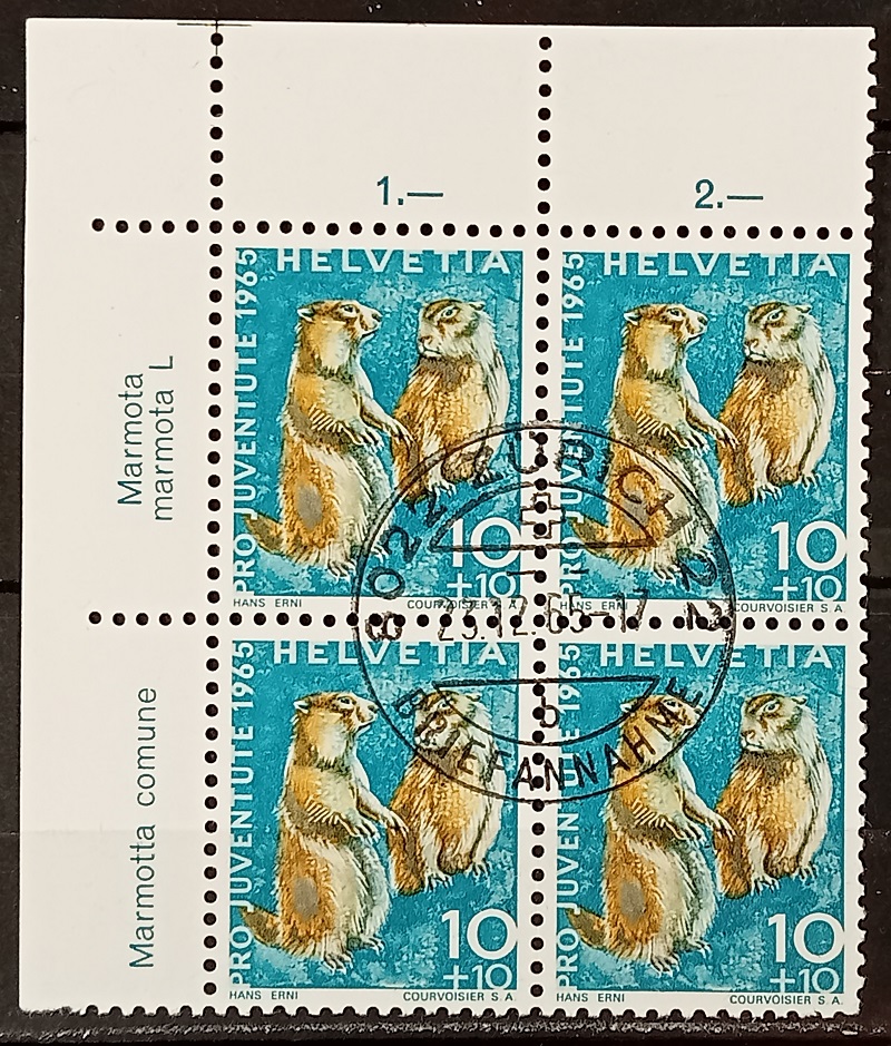 Viererbloack 4x10+10 C. Einheimische Wildtiere Alpenmurmeltiere. Gummierung intakt, schöner Stempel 23.12.65 - Zürich