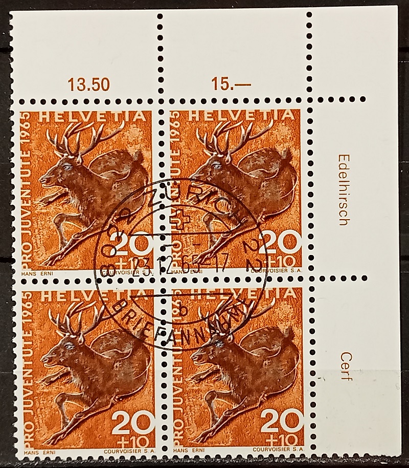 Viererbloack 4x20+10 C. Einheimische Wildtiere Edelhirsch. Gummierung intakt, schöner Stempel 23.12.65 - Zürich