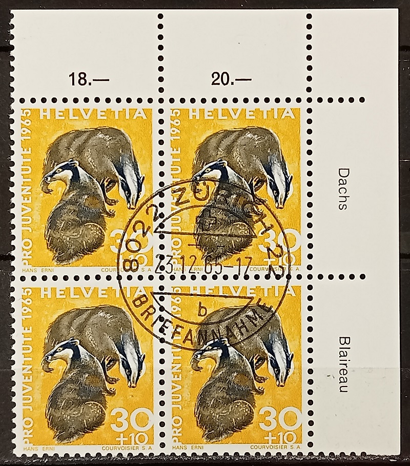 Viererbloack 4x30+10 C. Einheimische Wildtiere Dachse. Gummierung intakt, schöner Stempel 23.12.65 - Zürich