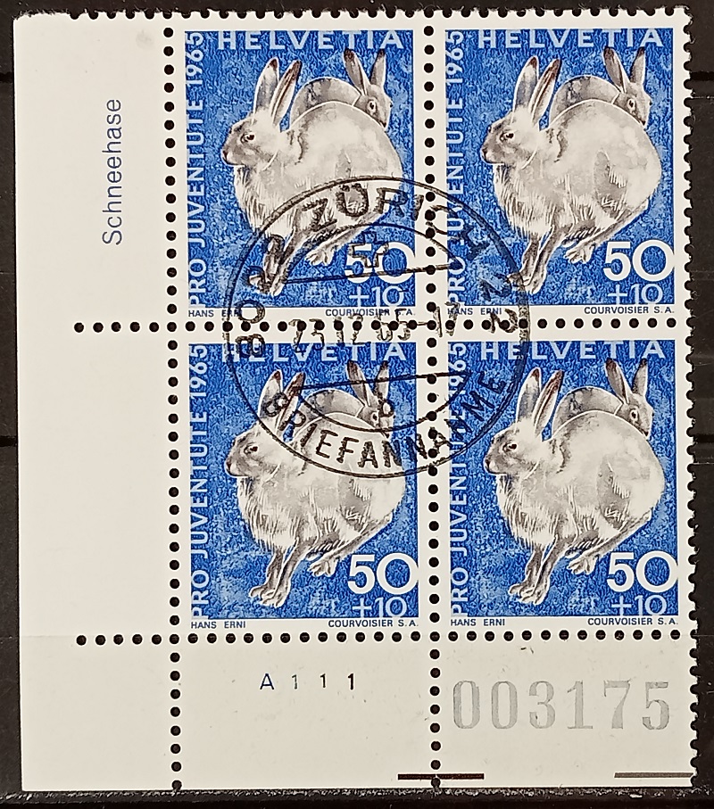 Viererbloack 4x50+10 C. Einheimische Wildtiere Schneehase. Gummierung intakt, schöner Stempel 23.12.65 - Zürich