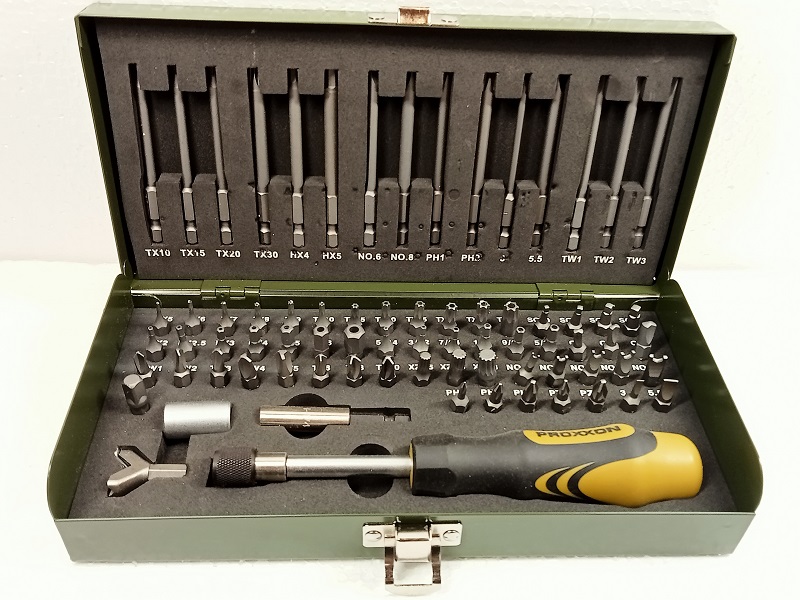 15 x extralange Bits (80 mm) für tiefliegende Schrauben in Sacklöchern. 55 x Standardbits (25 mm), 1 x Schrauber mit Federhülse für blitzschnelles Wechseln der Bits.