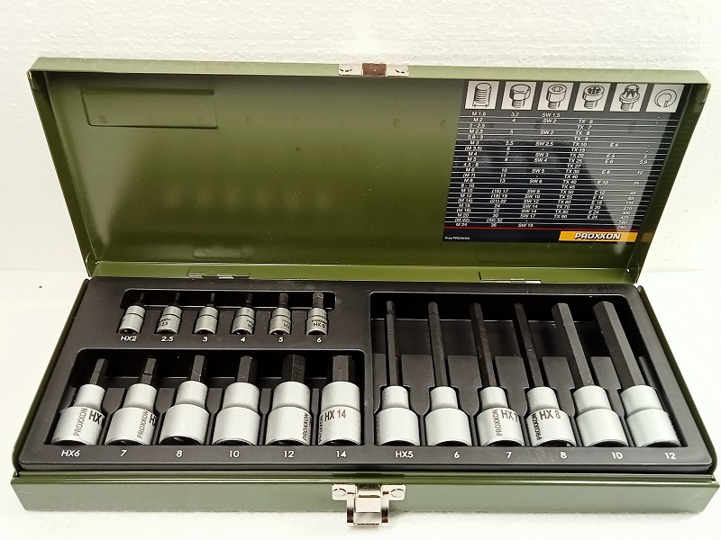 Klingen aus hochlegiertem Spezialstahl für extreme Härte und Verdrehzähigkeit, Sockel aus CrV-Stahl in Blechkassette. Enthält 6 x Nüsse 1/4"-2 - 2,5 - 3 - 4 -5 -6; 6 x Nüsse 1/2" kurz - 6 - 7 - 8 - 10 - 12 -14 mm; 6 x Nüsse 1/2" lang - 5 - 6 - 7 - 8 - 10 - 12mm