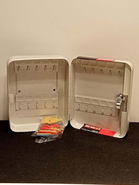Stahlblechkasten mit Zlinderschloss und 2 Schlüssel. 20 Aufhängehaken, inkl. Schlüsseletiketten zum Beschriften. Grösse (HxBxT) 200x160x80 mm