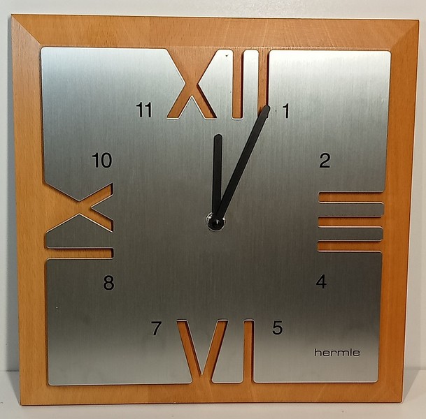 Edle und moderne Wanduhr aus Buchenholz 27 x 27 cm. Zifferblatt Alu 23 x 23 cm. Quartzwerk Hermle. Vorrat = 1 Stück