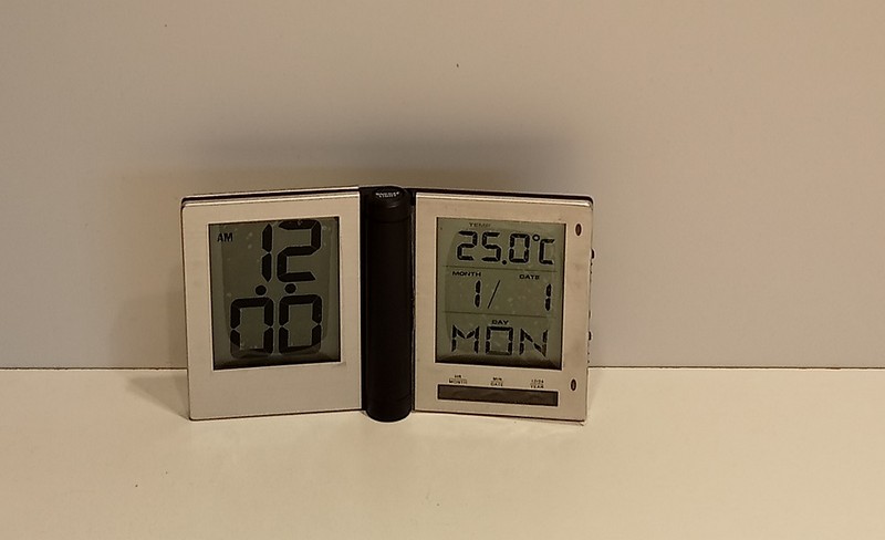 TFA. Elektronischer Reisewecker zusammenklappbar. Batteriebetrieb. Mit Datum, Wochentag, Temperatur. Weckwiederholung. Grösse offen ca. 13 x 8 cm